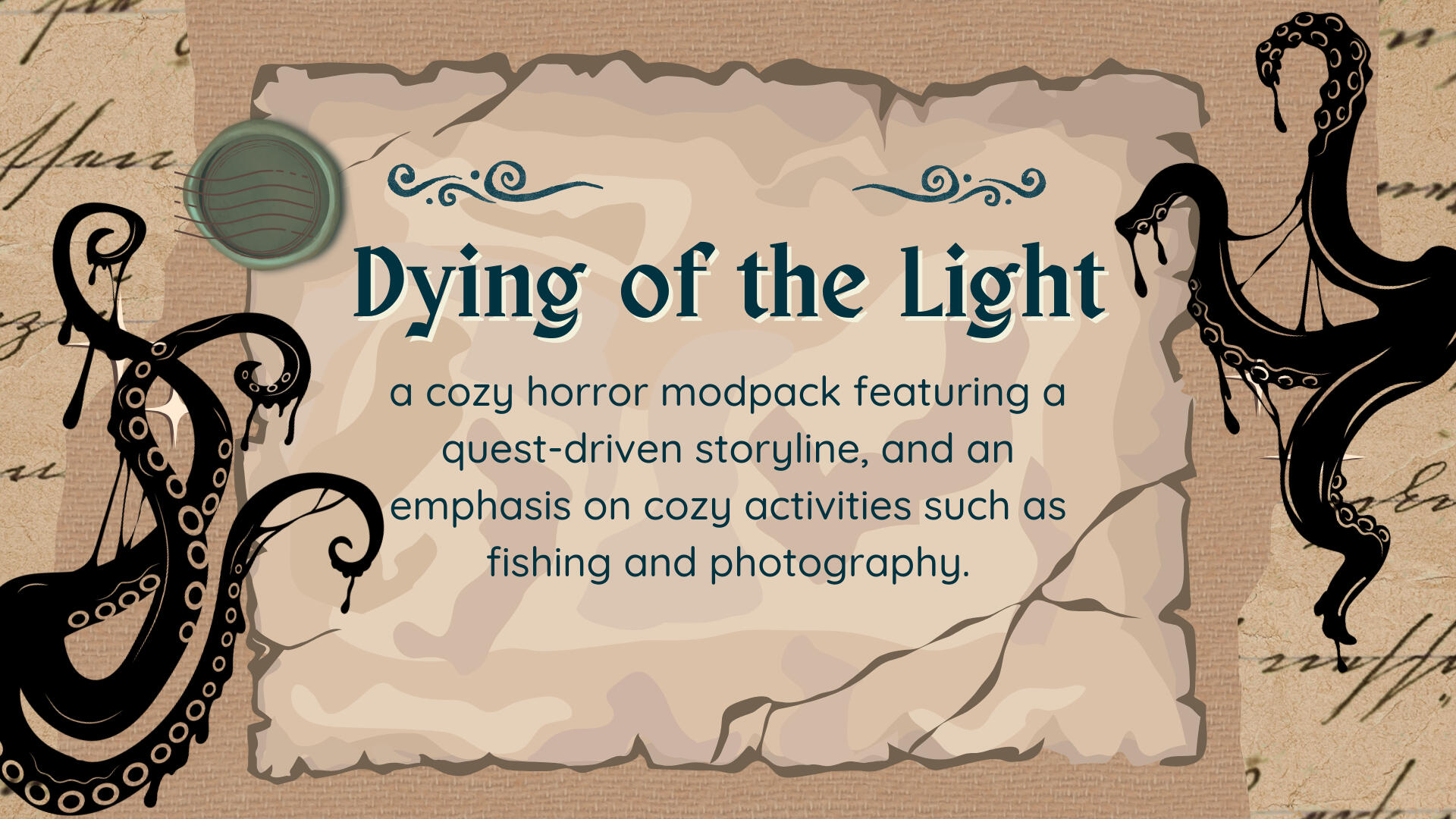 This is Dying of the Light, a cozy horror modpack designed by Katu, the maker of the Cottage Witch series of modpacks. Katu is a disabled artist who loves cats, cute things, cozy gaming... and also spooky stuff. This modpack is inspired by her love for Dredge and Strange Horticulture, as well as, obviously, Minecraft.Dying of the Light released in October 2024, and is meant to be an eerie, atmospheric modpack with a definite beginning and end, with a bittersweet story to guide you through the experience. It is made for Forge on Minecraft 1.20.1.